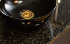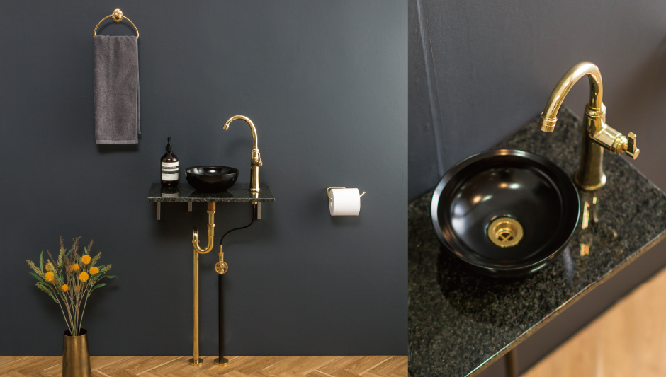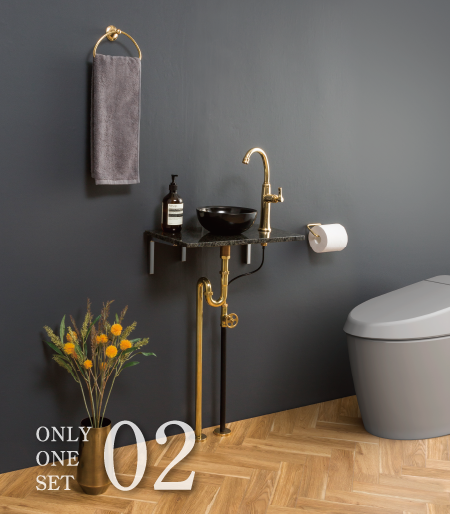 チャコールグレーの壁とヘリンボーン柄の床に、石材カウンターや真鍮製の金物を組み合わせ「ハードモダンテイスト」に。ダークトーンの壁と床に、手洗器や石材、真鍮それぞれが持つ独特の輝きがいっそう際立ち、個性的な空間にまとまりを感じさせます。従来、隠したくなる給排水管も、細部のあしらいや素材感にもこだわったものを使用することで「見せる配管」を実現しています。
