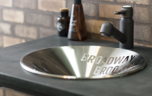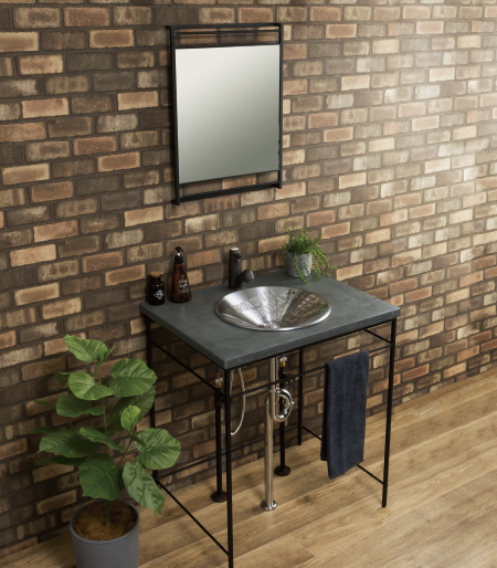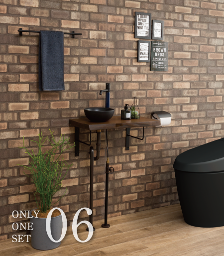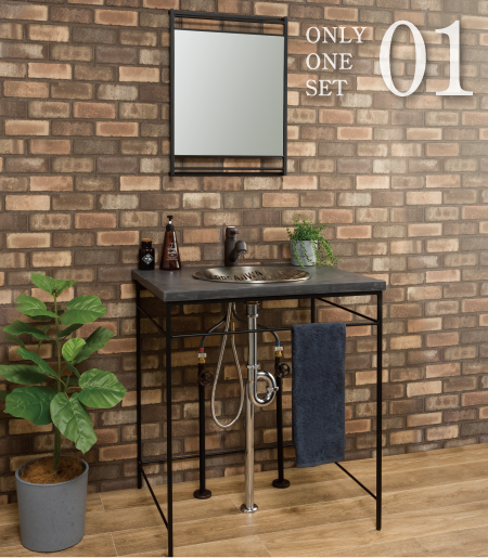 アンティークレンガの壁とくすんだ色合いのオーク材の床で「ブルックリンスタイル」に仕立てた空間に、ステンレスの手洗器とコンクリート調カウンターの素材感がアクセントを効かせつつ、さらにブルックリンスタイルの様相を高めています。また、存在感を抑えたアイアン製のカウンターフレームにすることで、全体の印象のバランスを図ったセットにしています。