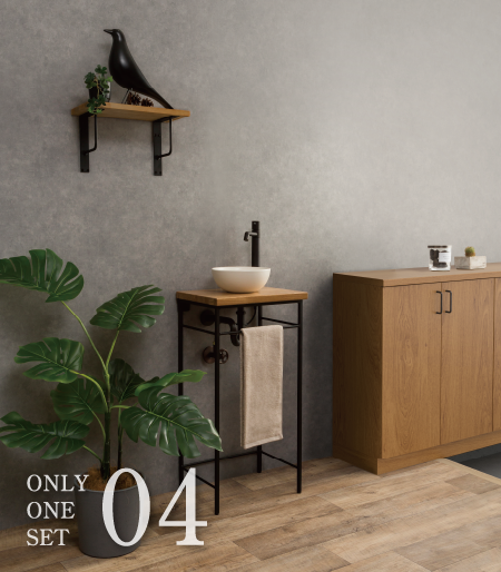 コンクリートの壁とラフソーンが印象的な床に、タモ材とアイアンフレームを組み合わせ「インダストリアルテイスト」に。線の細いアイアン部材でできたカウンターフレームの黒いラインが、コンクリートの無機質な雰囲気にしっくりと馴染みます。玄関シーンではカウンター下をスッキリと見せるために給排水は壁出しに。トイレシーンではストックを置くなど見せる収納スペースとしても有効活用できます。