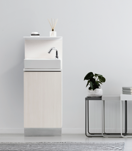 洗練された暮らしと心地よさをそのままカタチにしたようなハンドウォッシュユニット。スタイリッシュなフォルムには、壁への水跳ねに配慮したバックパネルや小物置きとして使えるシェルフなど、シンプルで使いやすいデザイン設計が施されています。