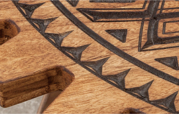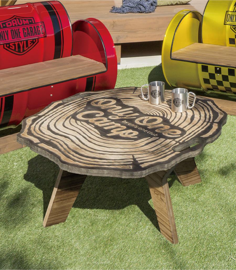 天板に彫り込み加工を施した個性的なテーブル。オンリーワンキャンプオリジナルの天板デザインで、アウトドアシーンを賑やかにします。
