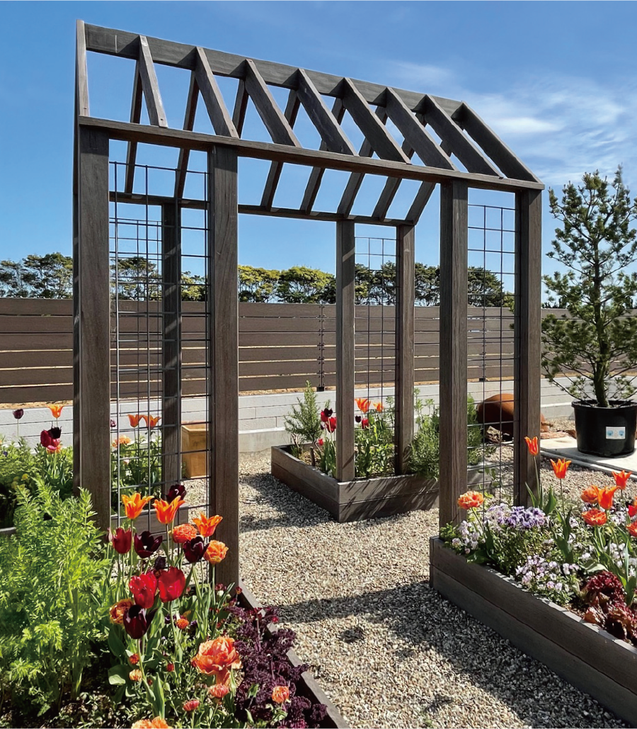 育てる、食べる楽しみがいっぱいのキッチンガーデンを実現する「ガーデンクロフトゲート」。お庭の主役となるアーチと適度なサイズ感の菜園ボックスには国産ヒノキを使用。メッシュパネルでさらなる演出が可能です。