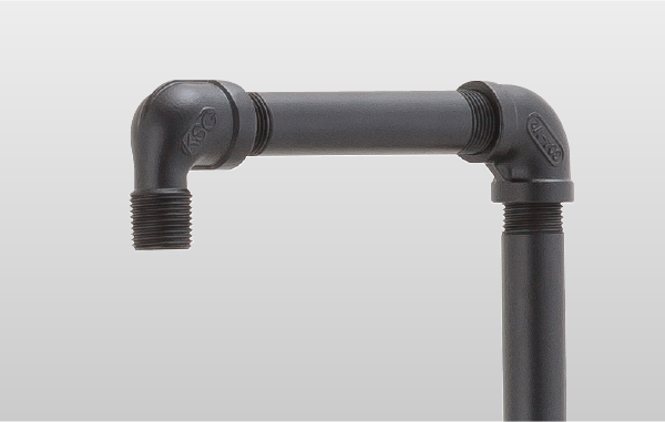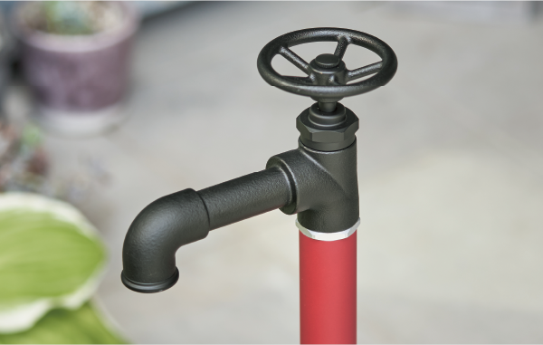 むき出しの水道管をイメージした、長い吐水口と大きめのハンドルが特徴の水栓柱。個性的なのに使いやすく、どこかぬくもりのある水栓柱です。