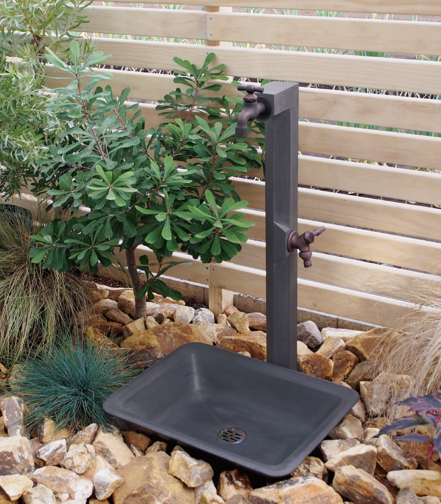 GRC 素材を生かし、グレーカラーでシンプルにまとめた水栓柱とガーデンパン。単色でありながら、面取りした形状がコントラストを生み、様々な表情を魅せてくれます。