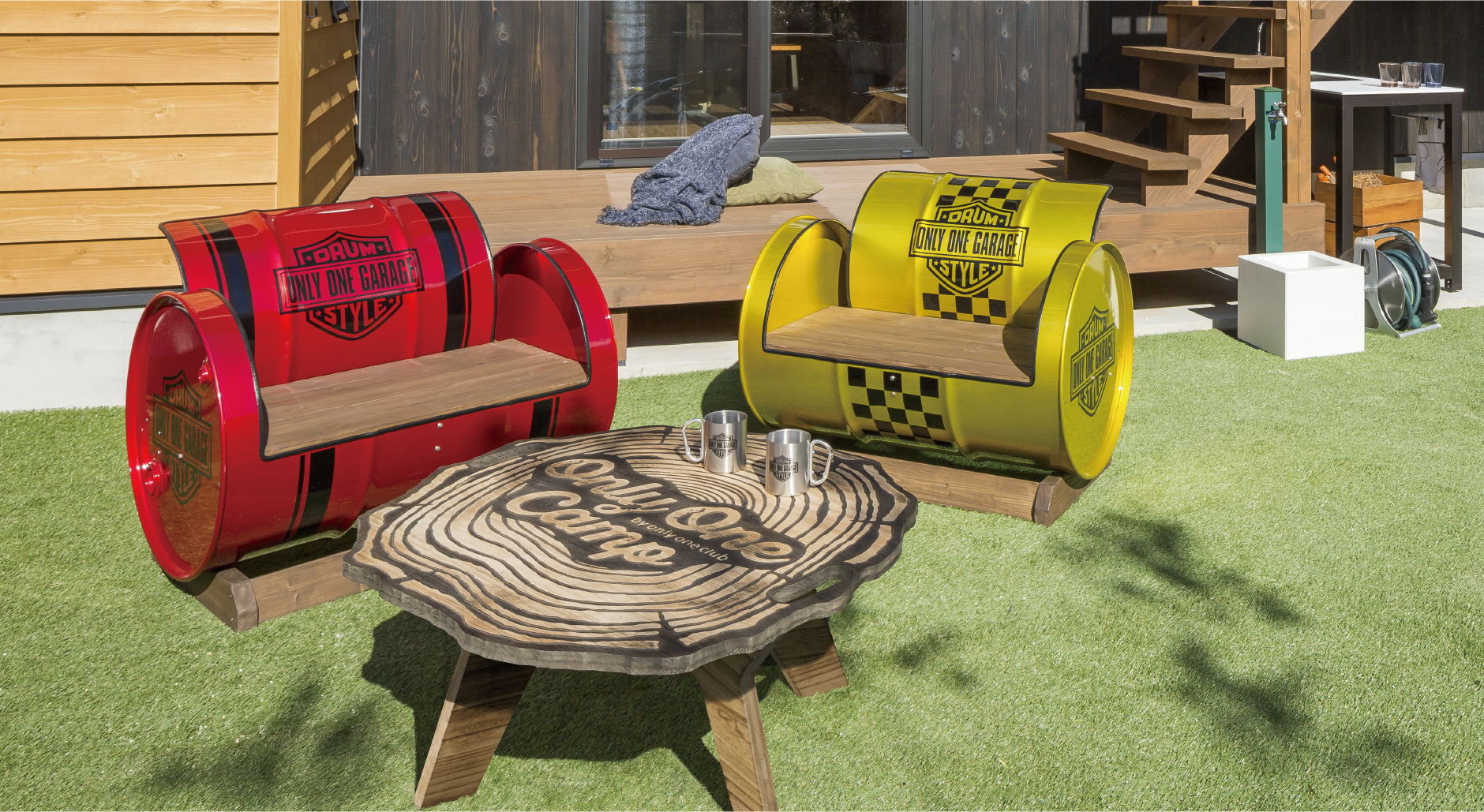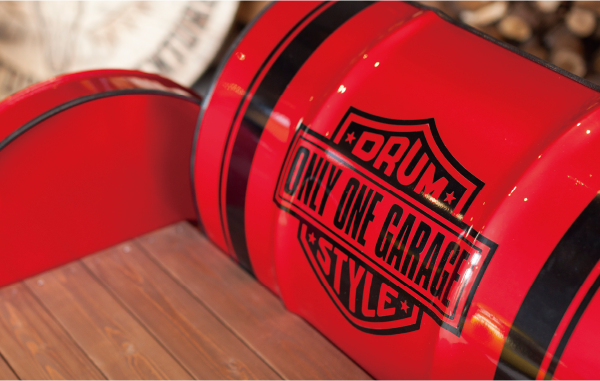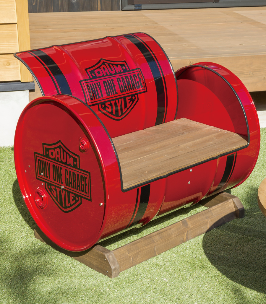 ドラム缶をリユースして個性豊かに仕上げました。また、背もたれや側面の装飾柄は、オーダーデザインも対応可能です。