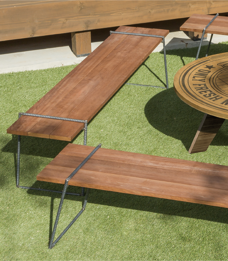 堅くて重い南洋材のハードウッドを座面に、異形鉄筋を脚として利用したアイアンレッグベンチ。素材感を生かしたシンプルなデザインは、様々なテイストにマッチします。