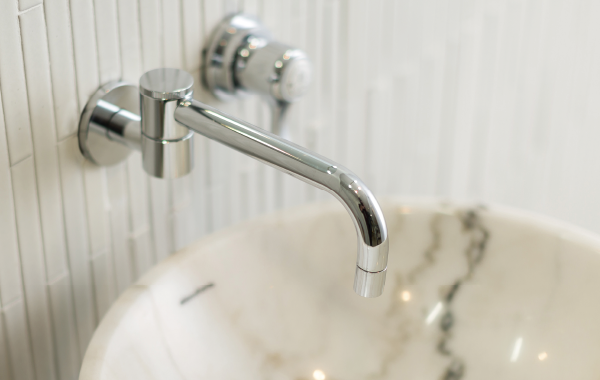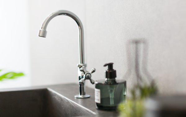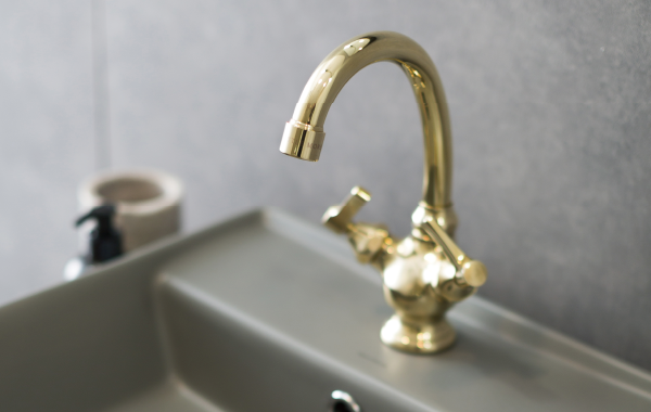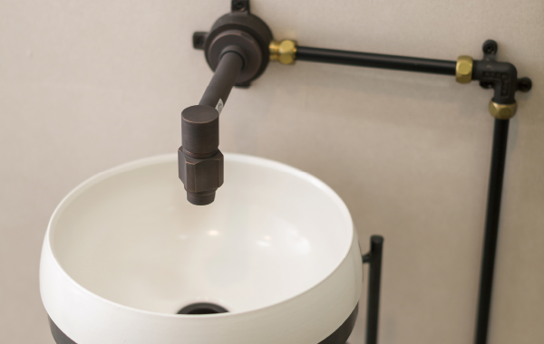 淡いピンクの石目が印象的な白いタイルの床に、レトロな衛生陶器のような手洗器と外部配管を組み合わせて「ウォームナチュラルテイスト」に。甘い印象になりがちな壁と床の組み合わせに、黒いフレームと配管パーツによって全体を引き締め、絶妙な甘辛なシーンを演出できます。水栓の横方寸は先端部先が回転ハンドルになっているため、周囲を濡らすことなく使うことができます。