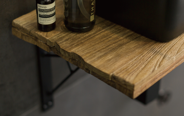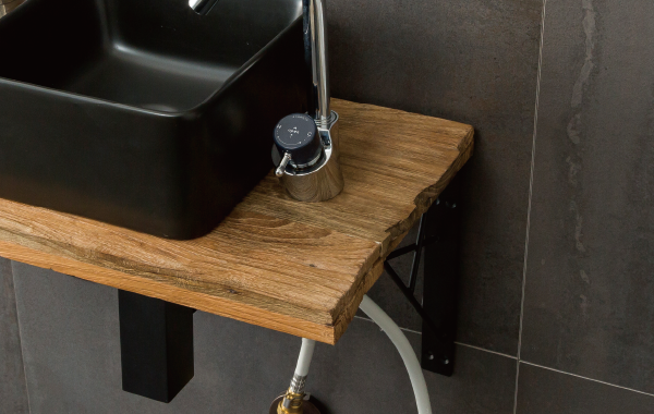 ダークグレーのタイルを壁と床、黒い手洗器と金物部材、チーク材のカウンターを組み合わせ「ダークラスティックテイスト」に。カウンター両端の凹凸や木目が浮き上がった古材感が、無機質なシーンに味わい深さを加えます。カウンター下の金物部材をダークトーンでまとめることで、全体に統一感をもたせつつ、黒い手洗器の印象を引き立てています。