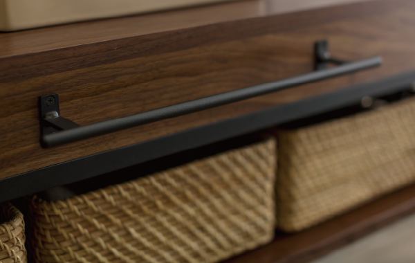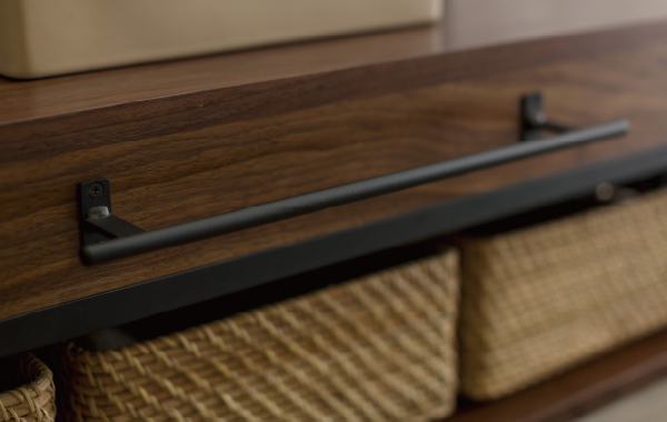 ウォールナットの落ち着いた色調と黒いアイアンフレームで確かな存在感を出しながら、オープンスタイルのデザインで開放感のある雰囲気を演出できます。