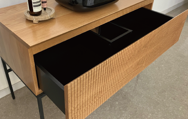 海外で人気が高まっている木のエングレーブ加工を施し、細いブラック脚でスッキリとスタイリッシュな洗面キャビネット。天板と表面は厚みを感じさせない斜めカットデザイン。引き出しとしても手がかけやすく操作性も兼ね備えています。