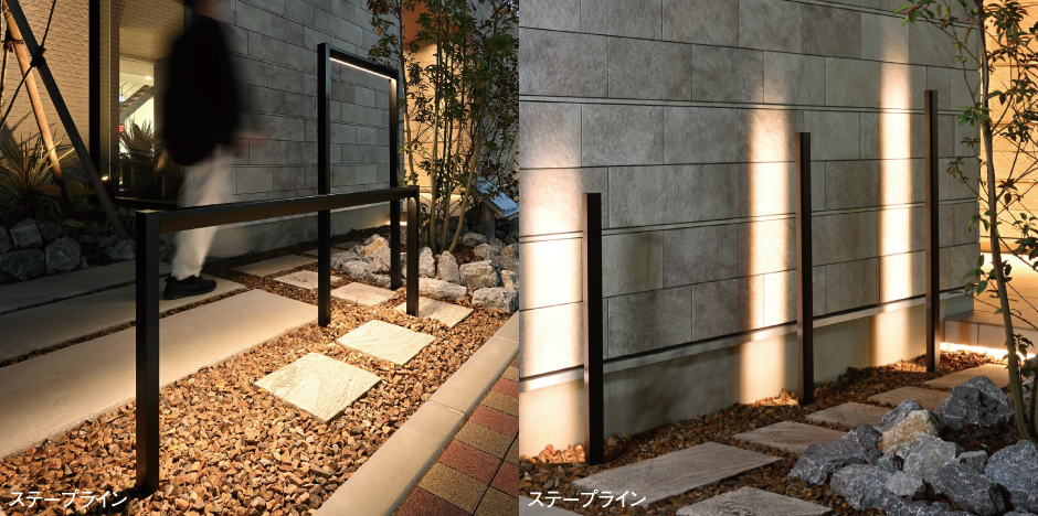 LED 内蔵アルミ形材を使った、シャープなラインから発する光が様々なシーンに対応するフレームシステムです。門周りや庭のまわりに光の演出をプラスしてくれます。どちらもサイズオーダーが可能です。