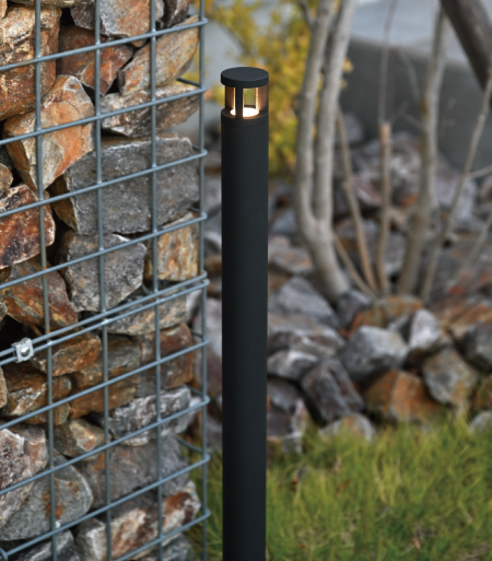 灯具部分をピラー(柱)のみにした開放感を持たせたデザインです。光が下方向に向くように反射板が灯具天井下部に取り付けてあるので、ピラーの影が地面に独特のシルエットを演出します。