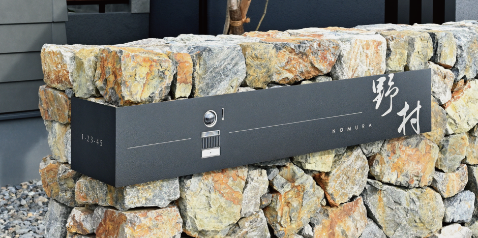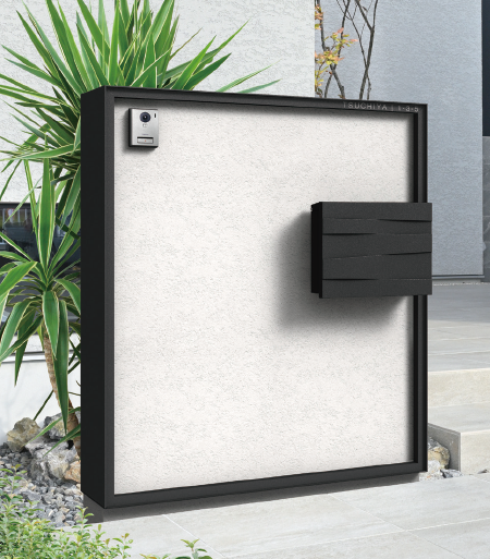 存在感のあるウォールに大容量宅配ボックス、口金ポストをコンパクトにセットしました。フェイス色をウォールと同色に統一することでシックで落ち着いた雰囲気に仕上げています。