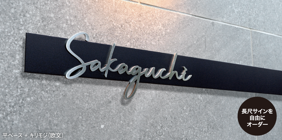 サイズ・ベースタイプ・文字タイプ・カラーを自由にオーダーできる長尺サインです。外構設計に組み込みやすく、シンプルな規格の中で様々な組み合わせが可能です。