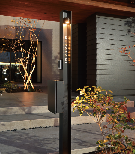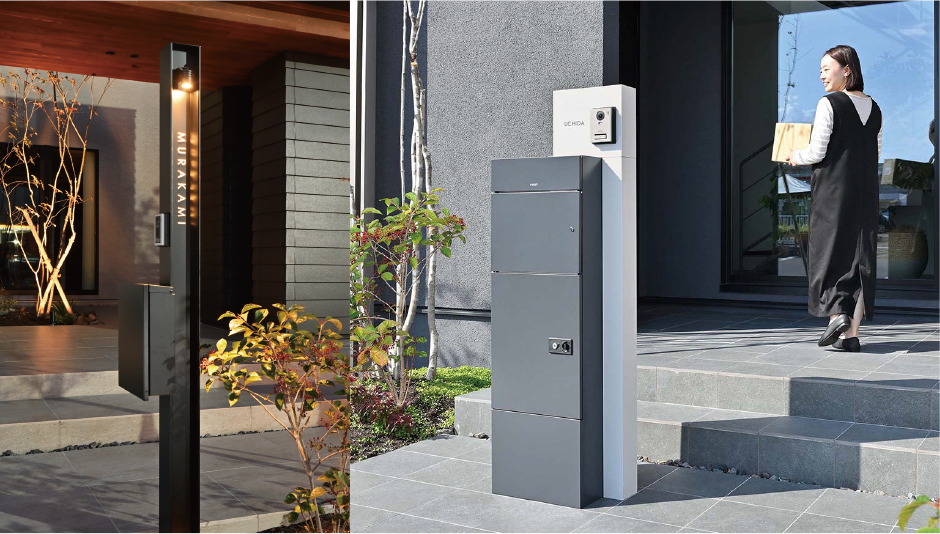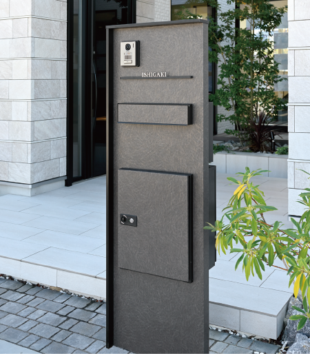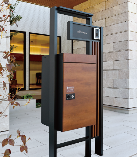 宅配ボックス、ポストが積み重なり、さらに表札とインターホンの L 字型のユニットが連結された機能門柱。