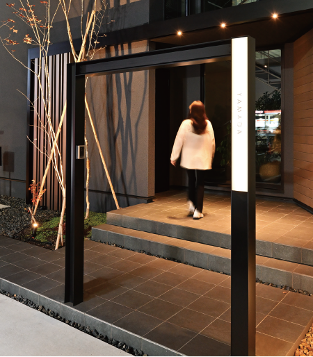 オンブルは戸建て住宅はもちろん、商業空間でも存在感を発揮します。ゲートタイプは連棟使いをすることでより魅力的に空間を演出できます。ロータイプはショップ前のサインや仕切りなどにおすすめです。