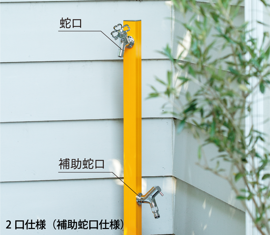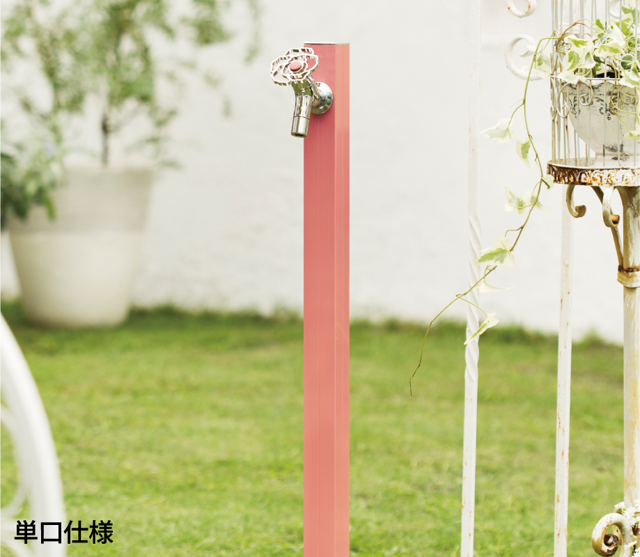植栽への水やりをしながら小物を水洗いするなど水を使うシーンはいろいろとあり、吐水口に取り付けたホースを頻繁に着脱するのが面倒に感じることもあります。2つの蛇口を取り付けられる2口仕様なら補助蛇口をホース専用として使用できるので面倒な着脱も無く使い勝手がアップします。オンリーワンクラブの水栓柱には同一デザインで単口仕様と2口仕様の2種類を揃えたものを多数ご用意しています。
