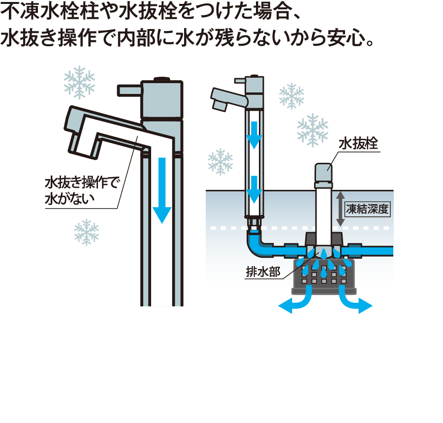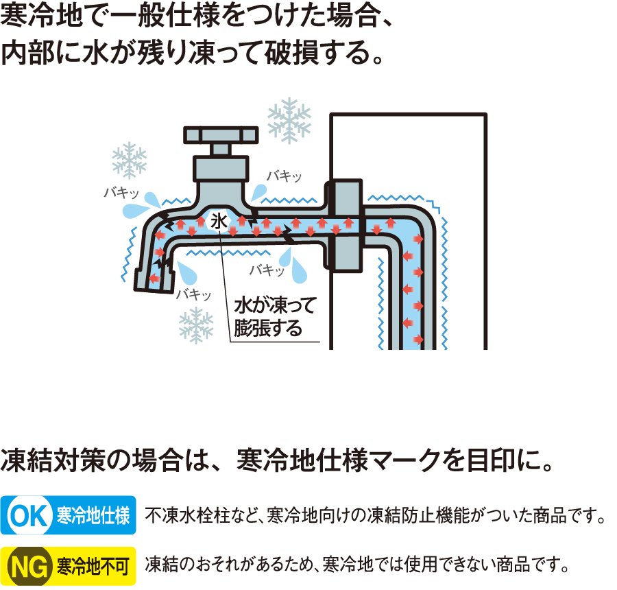 水まわりのアイテムで選ぶ際に注意したいのが、冬の寒さによる水道管の凍結です。屋外の水栓柱は寒さにさらされて特に凍りやすく、水道管の破損といった事故につながるおそれがあります。このような事故を防ぐため、厳しい寒さが予想される寒冷地では、凍結防止機能のついた「不凍水栓柱」を選ぶ必要があります。また、近年の異常気象による大寒波の影響で、普段寒冷地と呼ばない地域でも寒冷地並みの最低気温になり破損が発生した事例もありますので、お住まいの地域の環境をふまえた対策が必要です。