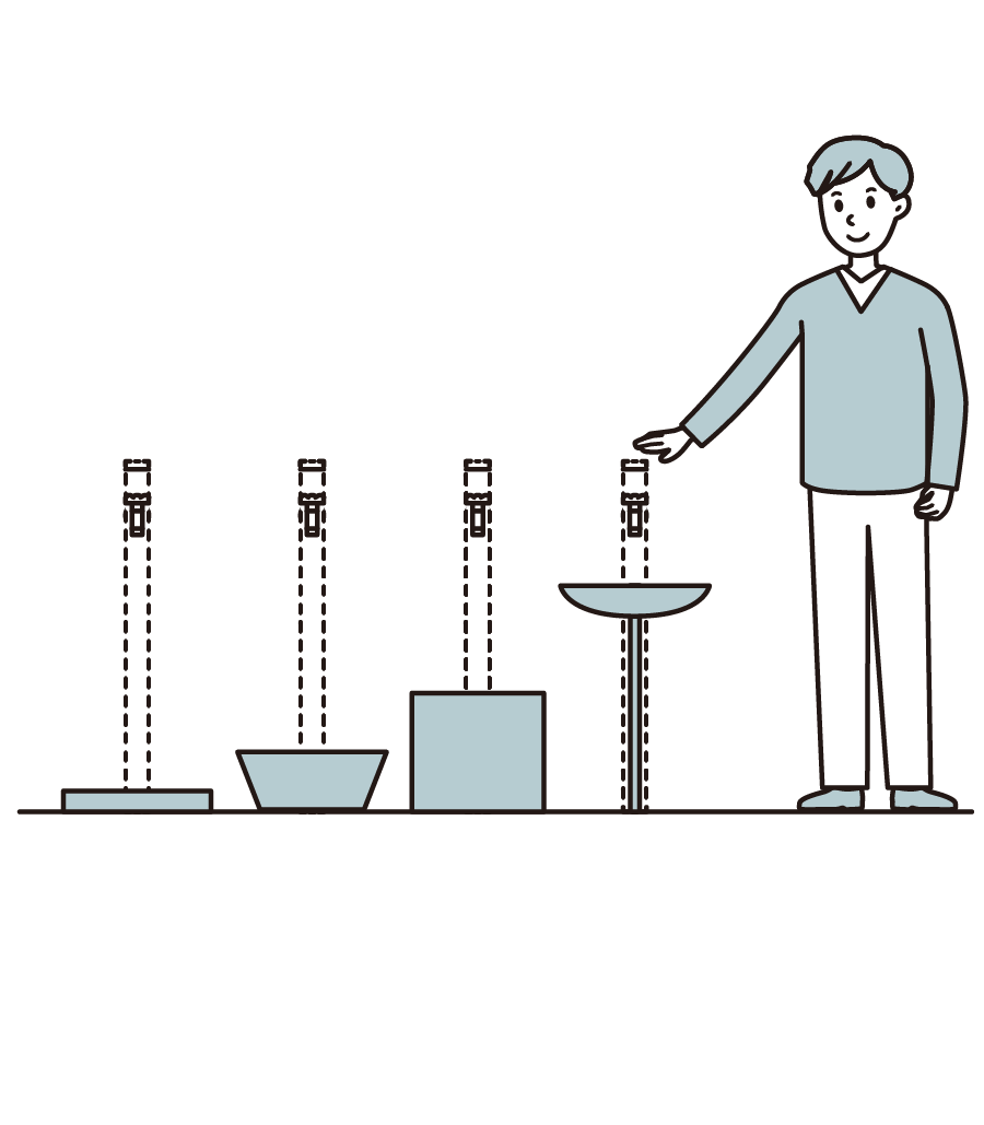 高さや太さなどのサイズを多彩にご用意。好みの蛇口を組み合わせるものと専用蛇口を設定しているものもあります。