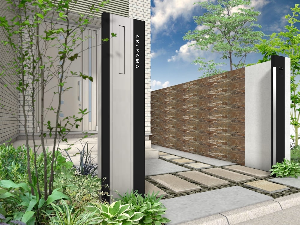 オンリーワンの表情をアクセントに取り入れたスタイリッシュな門周りデザインです。