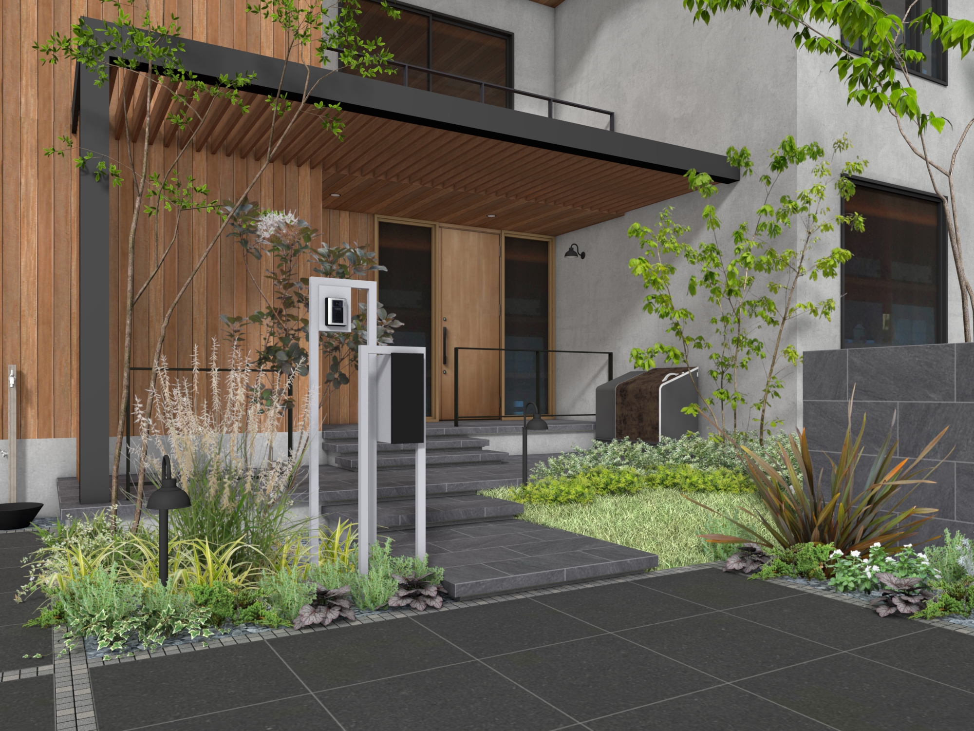 重厚感のあるブラックコーデでステンレスと木目のコントラストを引き立てるモダンファサード