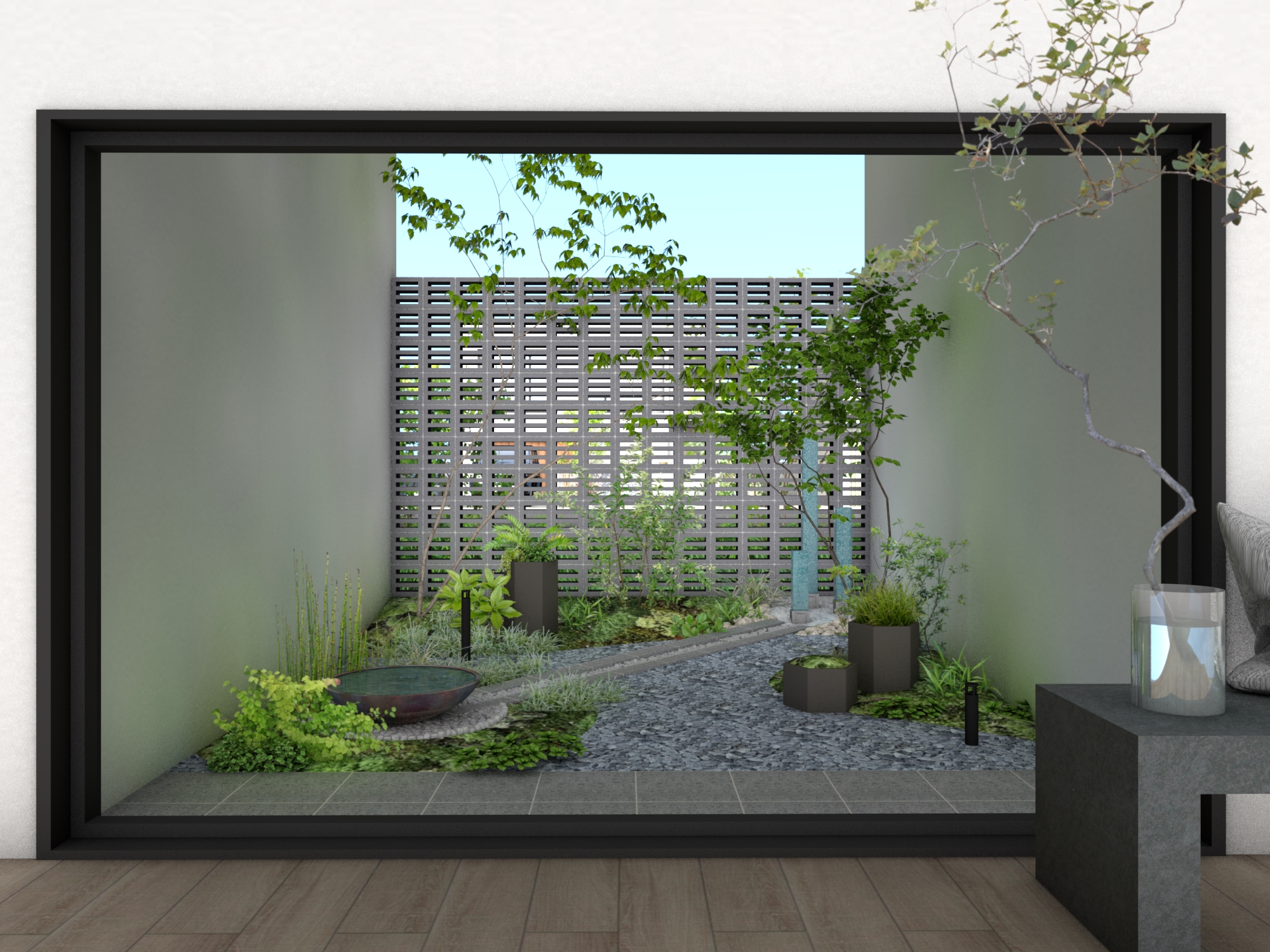 透明感のあるゴロタ石と光で水を表現した枯山水の坪庭