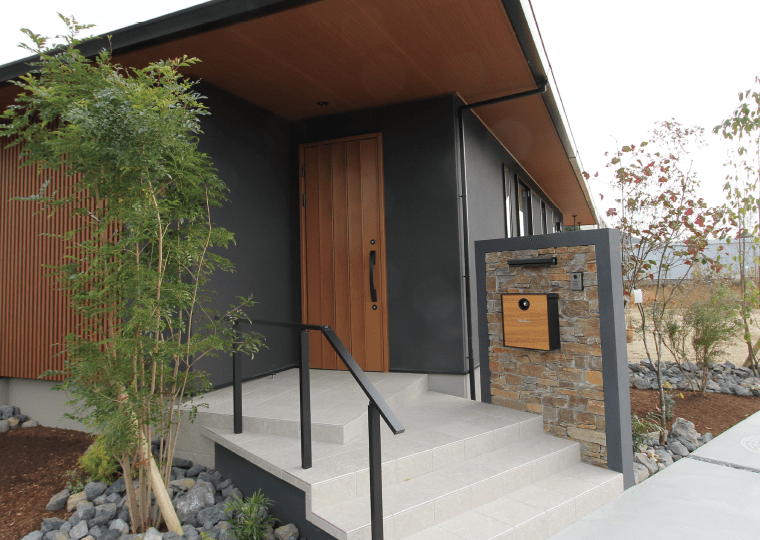木目コーデで統一感のある外構デザイン。