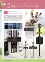 世帯住宅のエクステリア選び両親と一緒に笑顔で暮らしたい。2世帯のつながりを楽しむ住まい。TWO FAMILY HOUSETWO FAMILY HOUSEメタルの上品な魅力を詰め込んだレトロな2世帯対応機能門柱です。住まいのスペースやライフスタイルに合わせてお選びください。左右勝手違いを2 つ並べて2 世帯用としてもお使いいただける機能門柱。木目柱とステンレスの組み合わせが上品でモダンな雰囲気を演出します。EUDOユード P.55TWIM ツイ-ム P.55HAUSAハウザ P.55ONYXオニキス P.55NEW NEW NEW NEW アルミ機能門柱 2in1styleNEW 522住宅事情や働き方の多様化に伴い、2世帯同居のスタイルが増えています。一口に2世帯住宅と言っても分離・独立・共用・融合など2世帯がともに住む暮らし方には様々なタイプがあります。多様な住宅スタイルに合わせるエクステリアアイテムもまた多種多様。例えば玄関まわりの機能を一つにまとめた機能門柱も家族のスタイルに合わせてアイテムや設置方法、デザインが選べるタイプを多数ご用意しています。●実際の商品と写真は異なる場合があります。22E16