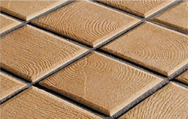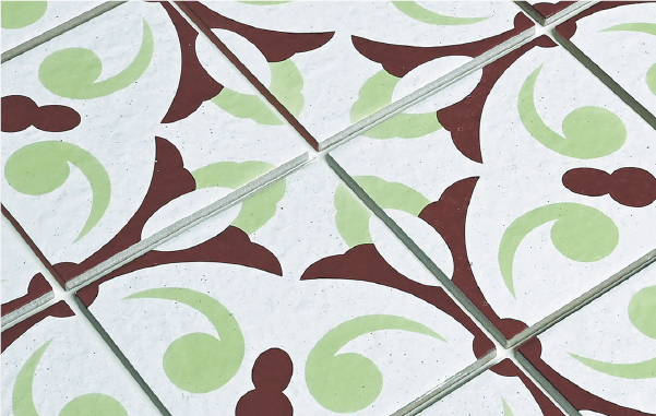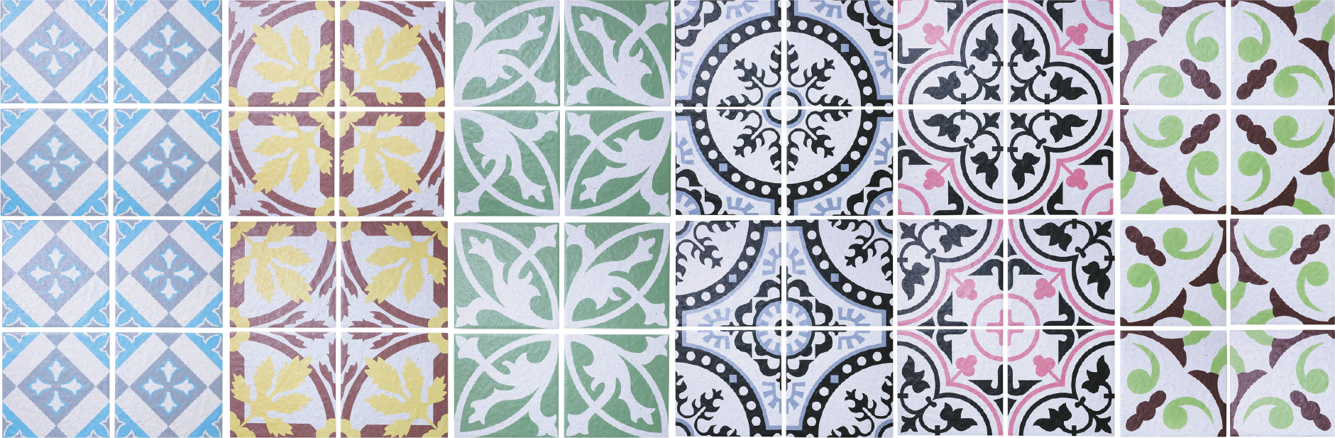 6種のデザインタイルと8色の無地タイルを組み合わせて、アレンジでき、どちらも表面には波のような凸凹があって汚れがつきにくく滑りにくいタイルです。デザインタイル4枚で大きなデザインパターンになり、付き合わせの向きによって2つのパターンができます。