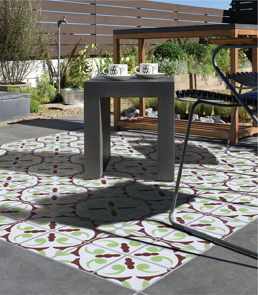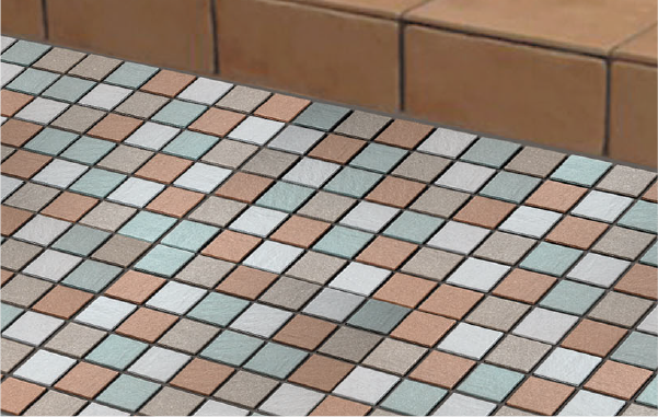 あらかじめデザインされたパターンのタイルを標準的なコンクリートブロックに張るためにパッケージされた商品です。このパッケージだけで使用数の計算や個別発注の手間がいりません。現場でカットして使用しますので、多少のサイズ変更にも対応できます。