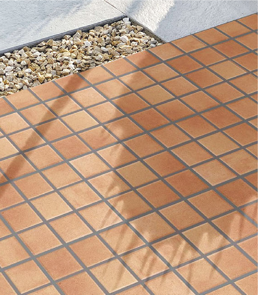 汚れにくいタイルは5センチ角とコンパクト。狭い場所の施工も収まりがよく、曲がりもご用意しているのでステップにもお使いいただけます。