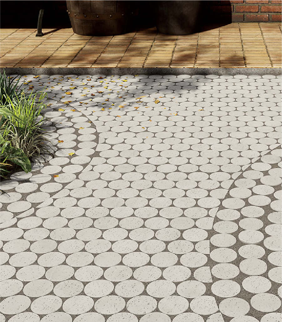 6 色のカラー煉瓦を組み合わせることで、これまでにない華やかなカラー煉瓦のデザイン表現が可能になりました。単色だけでなくミックスカラーの組み合わせで空間を明るく演出してください。さらに新しくピンコロが追加になり、敷くだけでなく積むレイアウトも楽しめるようになりました。