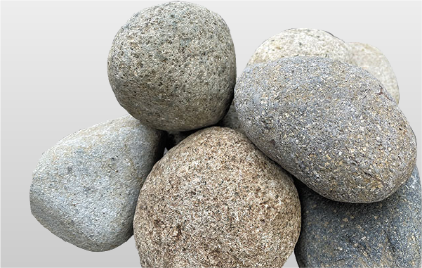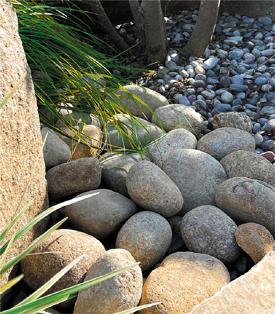 ナチュラルなシーンに角のないまあるい川石の「ナチュラルコブル」。ガビオンシリーズとのコーディネートも楽しめます。