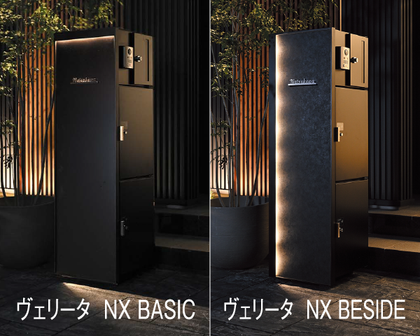 大型配達物が投函できるポストに、大容量宅配ボックスを2つも備えた、プレミアムな多機能ユニット ヴェリータNX。光の演出効果が異なるBASICとBESIDEの2つのデザインからお住まいに合わせてお選びいただけます。