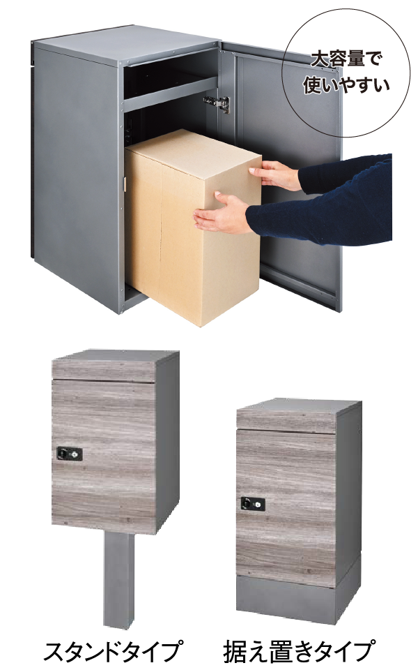 埋め込みタイプ、スタンドタイプ、据え置きタイプの3つの設置方法から選べる、大容量宅配ボックス付きの便利なポスト。大きく開く背面扉は配達物を一度に取り出せるので、使い勝手に優れています。