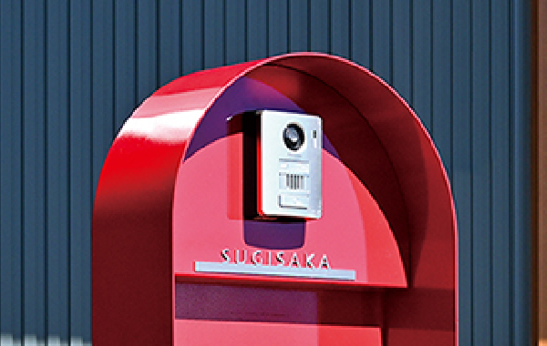 キャリーケースをモチーフにした、遊び心をくすぐるデザインポスト。男前でエグゼクティブを漂わせるデザインが、ファサードの印象をスタイリッシュに引き締めます。