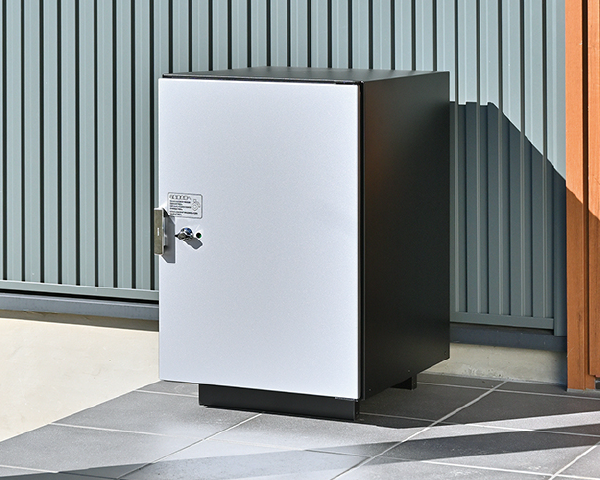 無駄の無いシンプルなデザインと11 色のカラーバリエーションで、使い勝手に優れた大容量宅配ボックス。玄関前の据え置きはもちろん、オプションスタンドと合わせて独立型としてもご使用いただけます。