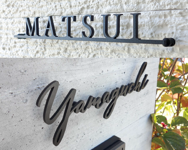 書家が壁面に書いた直筆サインのような雰囲気でファサードを彩る、和風モダンのステンレス切文字表札です。墨のにじみを生かした漢字とアルファベットは個性的であり、やがて親しみのある表札へと変わっていくでしょう。