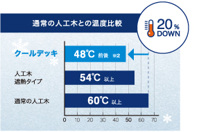 こども園・幼稚園・小中学校など公共施設向けに開発した高性能なデッキ材。芯材のアルミを人工木材で被覆し一体成型する特殊製法で、表層の割れや剥がれが発生しにくくなっています。デッキ表面は夏の炎天下でも手で触れられる 48℃を実現しました。安全対策や抗菌仕様のオプションもご用意しております。
