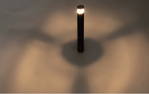 灯具部分をピラー(柱)のみにした開放感を持たせたデザインです。光が下方向に向くように反射板が灯具天井下部に取り付けてあるので、ピラーの影が地面に独特のシルエットを演出します。