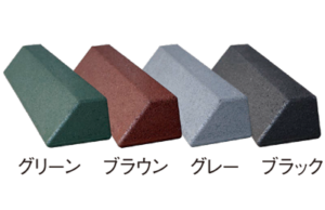 廃タイヤのゴムを細かく砕き、顔料で着色したゴムチップを特殊ポリマーで固めた、環境に配慮したソフトな車止めとスロープです。ゴムの特性である弾力性と衝撃吸収性を活かした製品です。