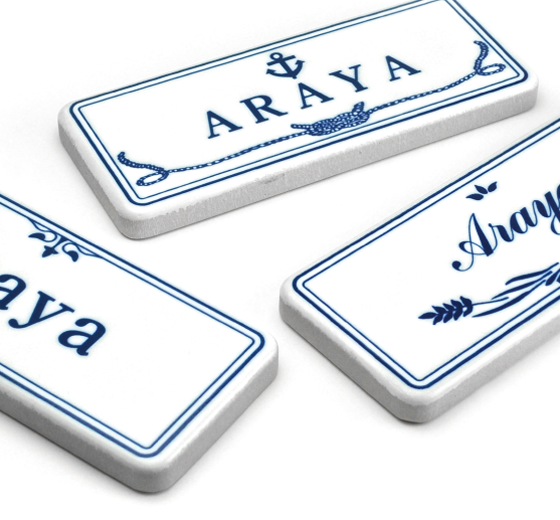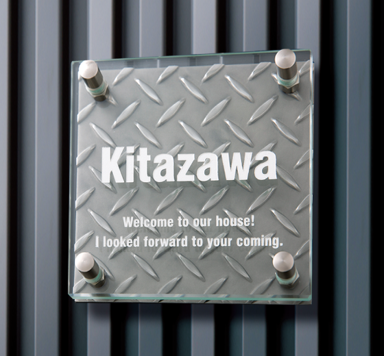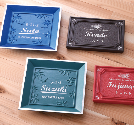 西海岸カリフォルニアをイメージしたお洒落なプレート風表札。オールドブルーやフロストアイボリーなど落ち着きのあるカラーが住まいに自然に溶け込みます。