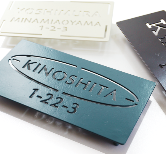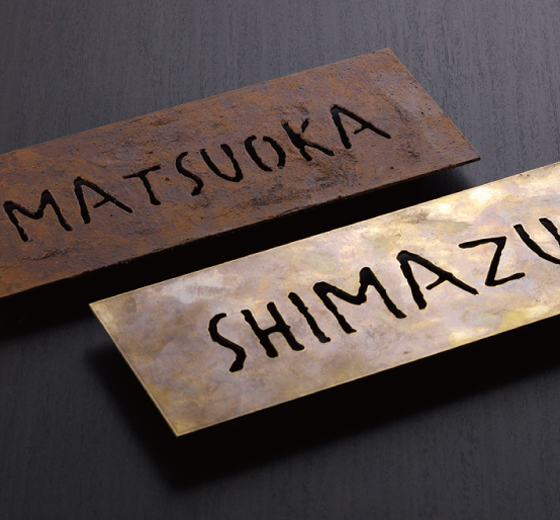プラズマ溶断で切り抜かれた断面が特徴的な、切文字のネームプレート。分厚い板材をラフな印象に仕上げた味のあるシンプルモダンなデザインです。