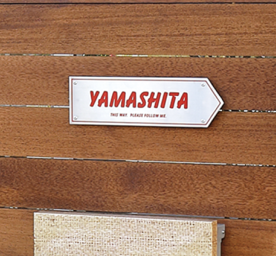 白い砂浜、波打つ海に自然に佇むビーチハウス。そんな風景から、サーフボードをモチーフにしたサインが生まれました。人工大理石で象られた遊びゴコロの効いたデザインです。