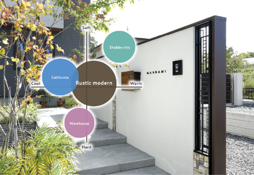 心が和むような温かみを持ちながらも、どこか洗練された雰囲気。 今、注目を集めるラスティックモダンスタイルとは、田舎風で素朴な スタイルに洗練さをプラスしたエクステリアのことをいいます。