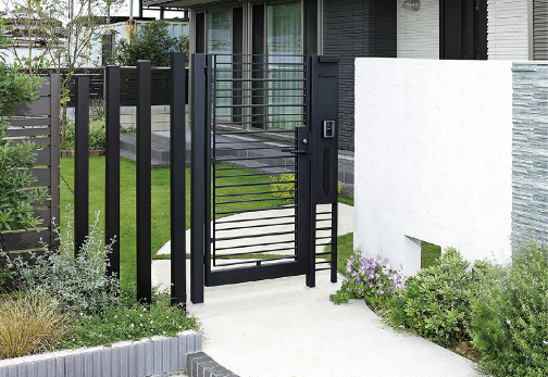 日本の伝統紋様や格子パターンを大胆に用いたアイアン製、機能門柱・門扉セット。門扉はデザインにより透け感や見え方が変わり、シーンに合わせたコーディネートが可能。日本らしさを大切にしながら、現代の暮らしや住宅に調和するようにデザインしています。