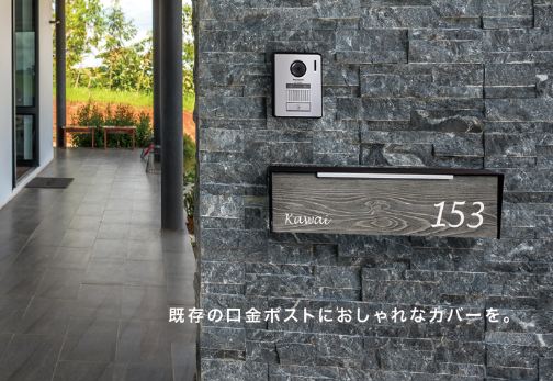 リアルな木目や質感を硬質低発泡ウレタン樹脂で再現。引き手金具にはステンレスをあしらい、上質なポストカバーに仕上がりました。お好みでオリジナルデザインのカスタマイズが可能です。