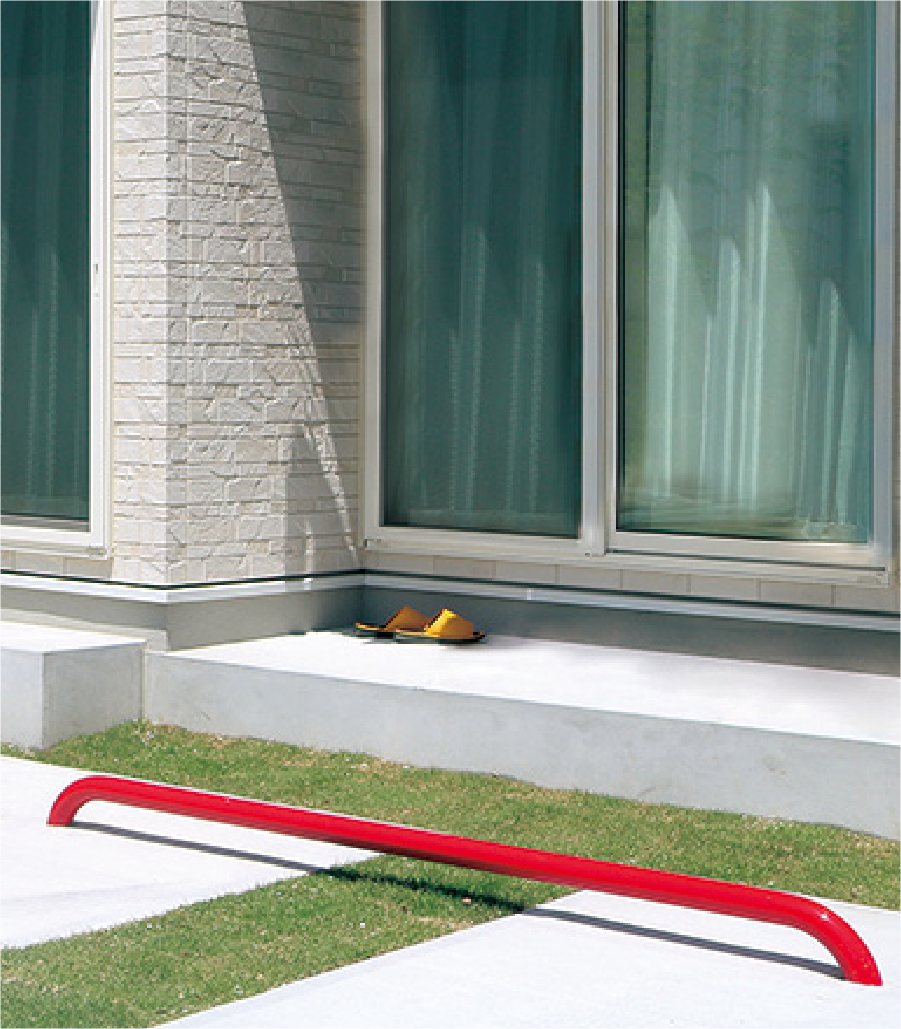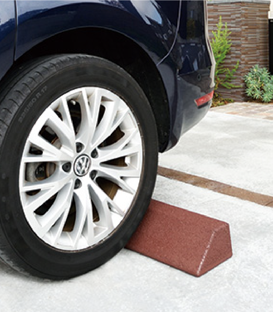 車だけでなく自転車や車椅子の乗り入れもスムーズにできるリサイクルゴムを使用した「ラバースロープ」。使用場所に合わせて高さも選べ、専用金具で簡単に連結できるので設置も容易に行えます。