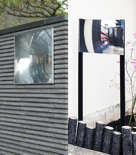 出っ張らないので違和感のないデザイン。目線と同じ高さに取り付けられるので、自然と安全確認ができます。素材は耐衝撃性、耐候性に優れたプラスチックで、割れにくく、長寿命の安心設計です。壁付タイプと自立埋込タイプをご用意しています。