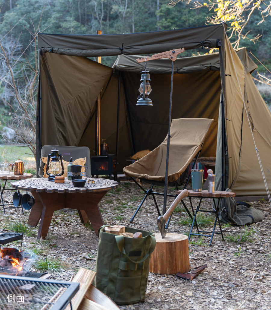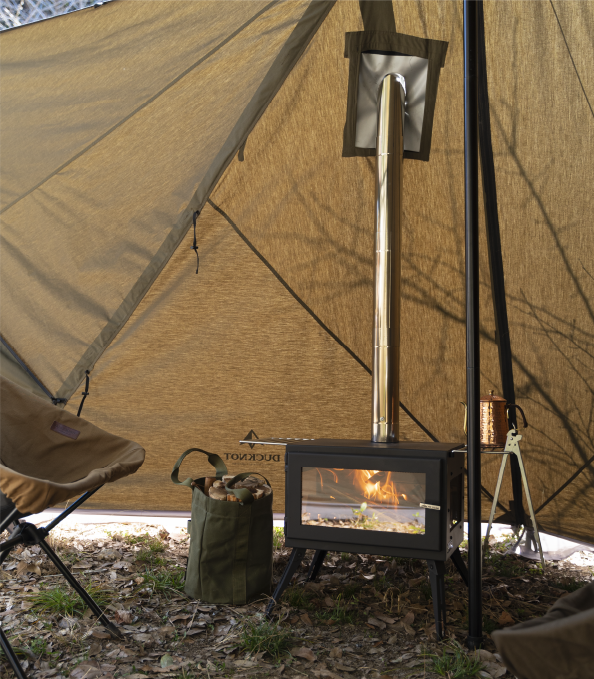 煙突用の穴が標準装備。テント内で薪ストーブが使えるから、夜や寒い季節でもテント内で暖がとれます。テント地には従来の化繊素材に比べ火の粉に強いハイブリッドT/Cを使用しています。